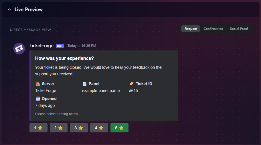 - Ticket Channel (Recommended): The bot posts an embed with 1-5 Star buttons inside the ticket channel.