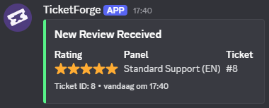 You can select a Public Feed Channel (e.g., #reviews). When a user submits a 4 or 5-star rating, the bot will automatically post a standardized "Review Card" in that channel to showcase your community's satisfaction.