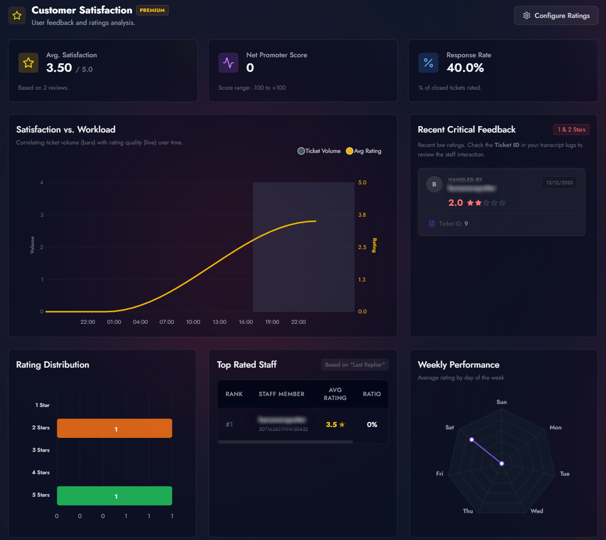 - Staff Leaderboard: See which staff members are receiving the highest ratings (based on who claimed the ticket or replied last).